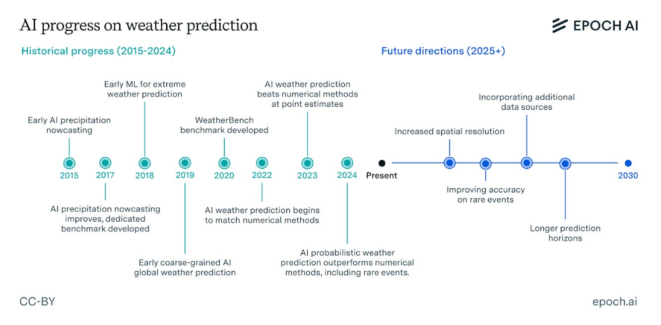 - Weather prediction: AI weather prediction already outperforms traditional methods from hours to weeks ahead. The next challenges lie in further improving predictions, especially rare events, and integrating new data sources.