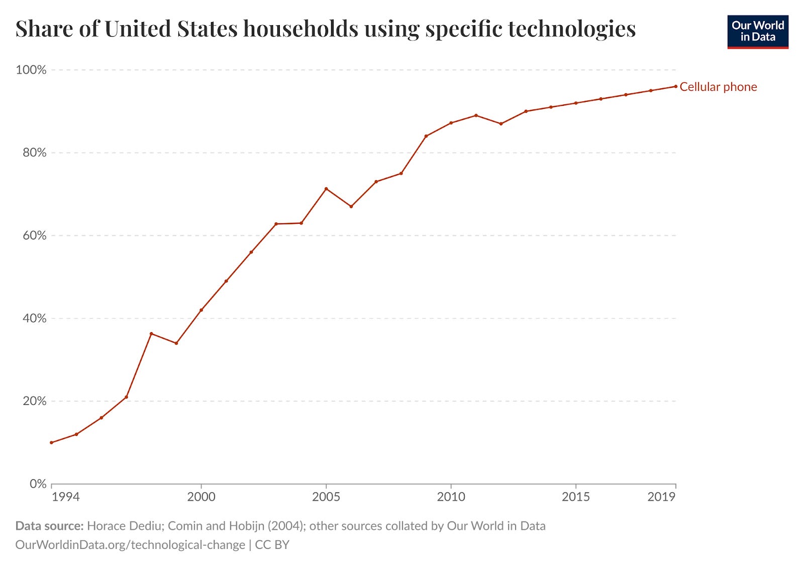 To illustrate, consider cell phones. Before cell phones existed, there was a major opportunity for increased spending on computing equipment as consumers adopted the technology. As smartphones advanced the technology by incorporating new features, this growth continued. However, at a certain point, widespread adoption and technological limitations led to market saturation, slowing the growth of consumer spending on cell phones. In other words, cell phones provide diminishing returns in terms of utility—owning a second one offers little added benefit because an individual can only actively use one at a time.