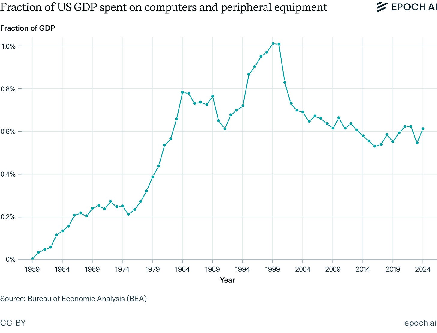 Yet it is important to keep in mind the earlier discussion about computing paradigms. Before 2000, it also seemed natural to assume that aggregate spending on computer hardware would continue rising alongside advances in computing hardware, a belief that was supported by decades of data. Yet, following the dot-com crash and later stagnation in computer adoption, this trend reversed, and the share of GDP devoted to computing began to decline.