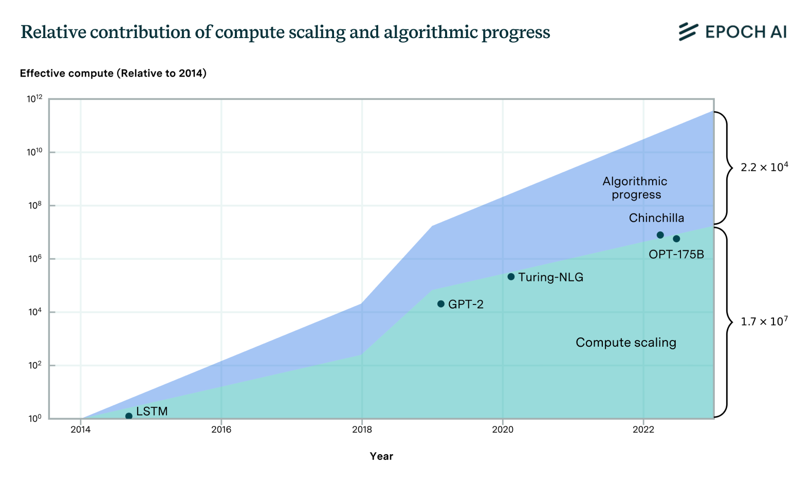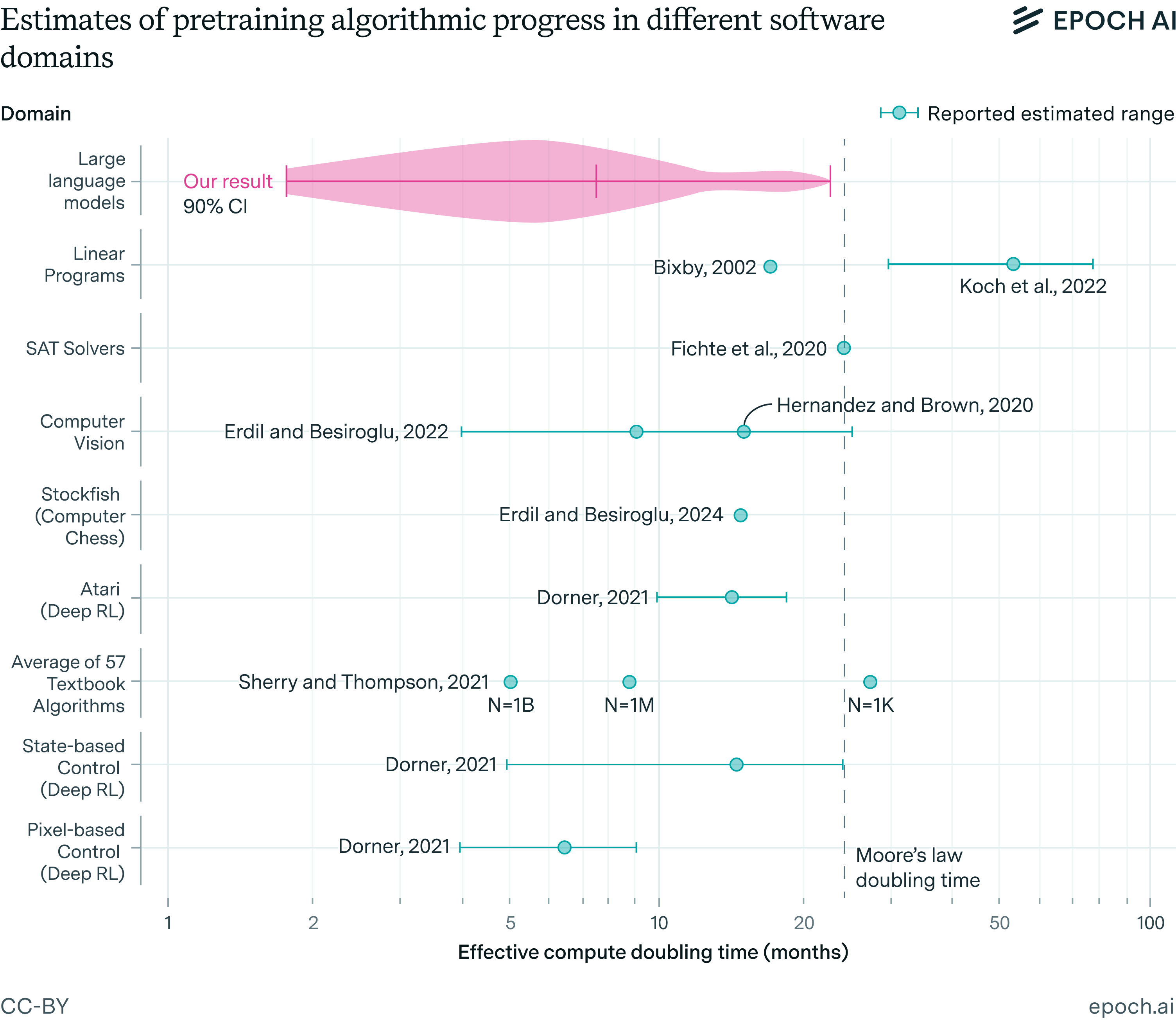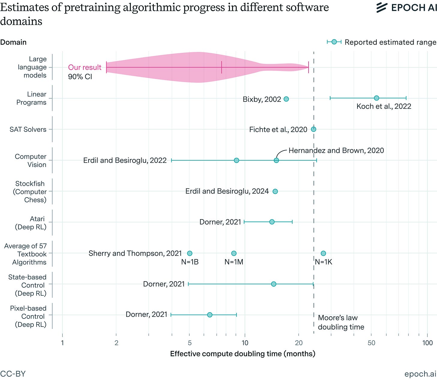 Epoch AI and other organizations have documented a remarkable rate of algorithmic progress over the past decade. While there is great uncertainty, the best existing estimates suggest that the amount of compute needed to achieve a given level of pre-training performance for LLMs has been shrinking on average by a factor of approximately 3 each year—significantly faster than Moore’s law. If we were to include improvements to post-training enhancements, the rate would be even more rapid.