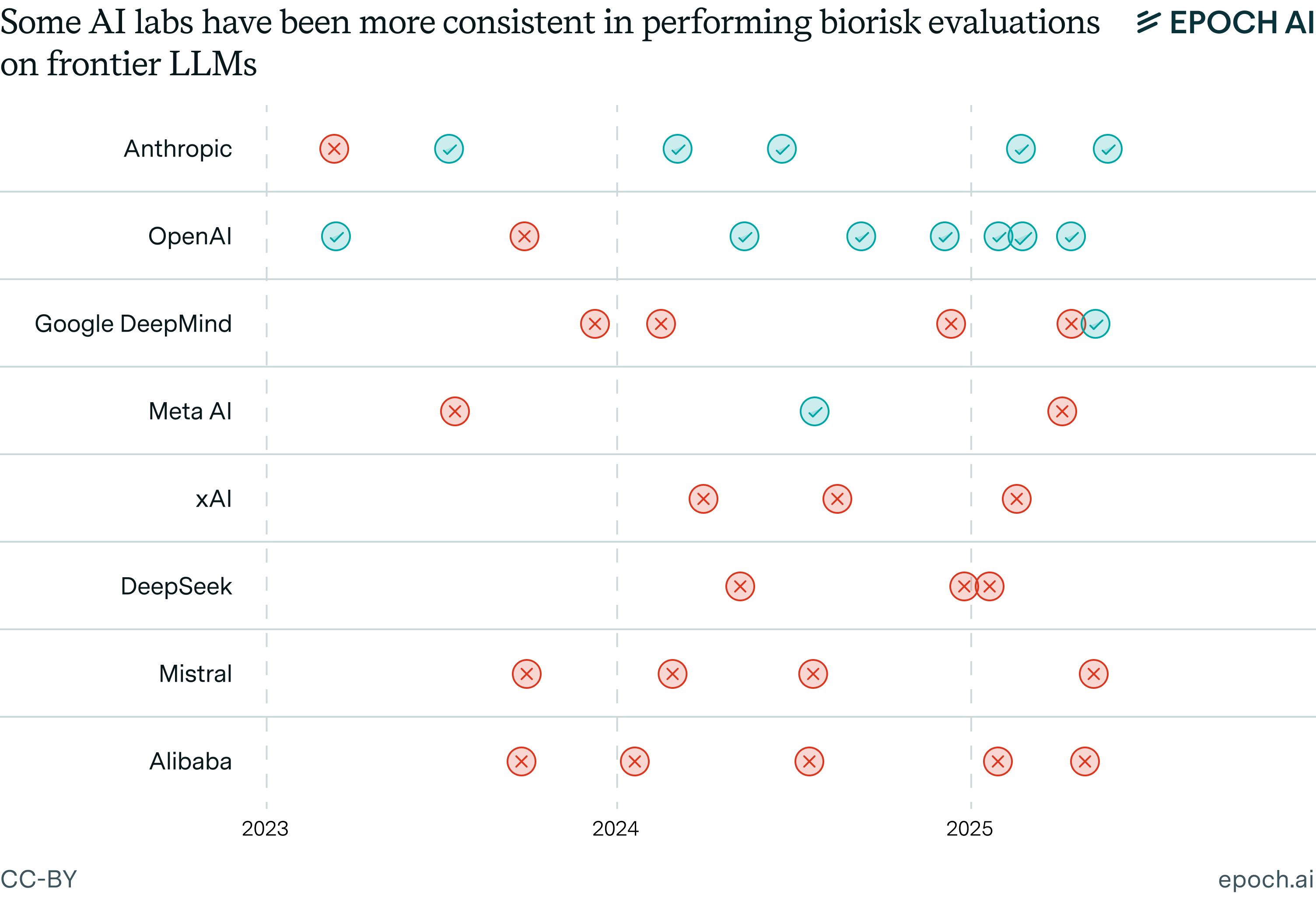 It’s also apparent that some AI labs have been much more comprehensive in reporting their biorisk evals than others. Anthropic stands out among all labs in this regard, including a range of ten different biorisk evals for Claude Opus 4, compared to four from o3 and o4-mini (and importantly, more detail is provided for each of Anthropic’s evaluations, e.g. in terms of their concrete risk thresholds). Google DeepMind’s evaluations of Gemini 2.5 Pro and Meta’s evaluations on Llama 4 are less comprehensive still.14 The remaining four labs that we looked into are xAI, Mistral, Alibaba, and DeepSeek. To our knowledge, these labs have not released any information about whether biorisk evaluations have been performed.15