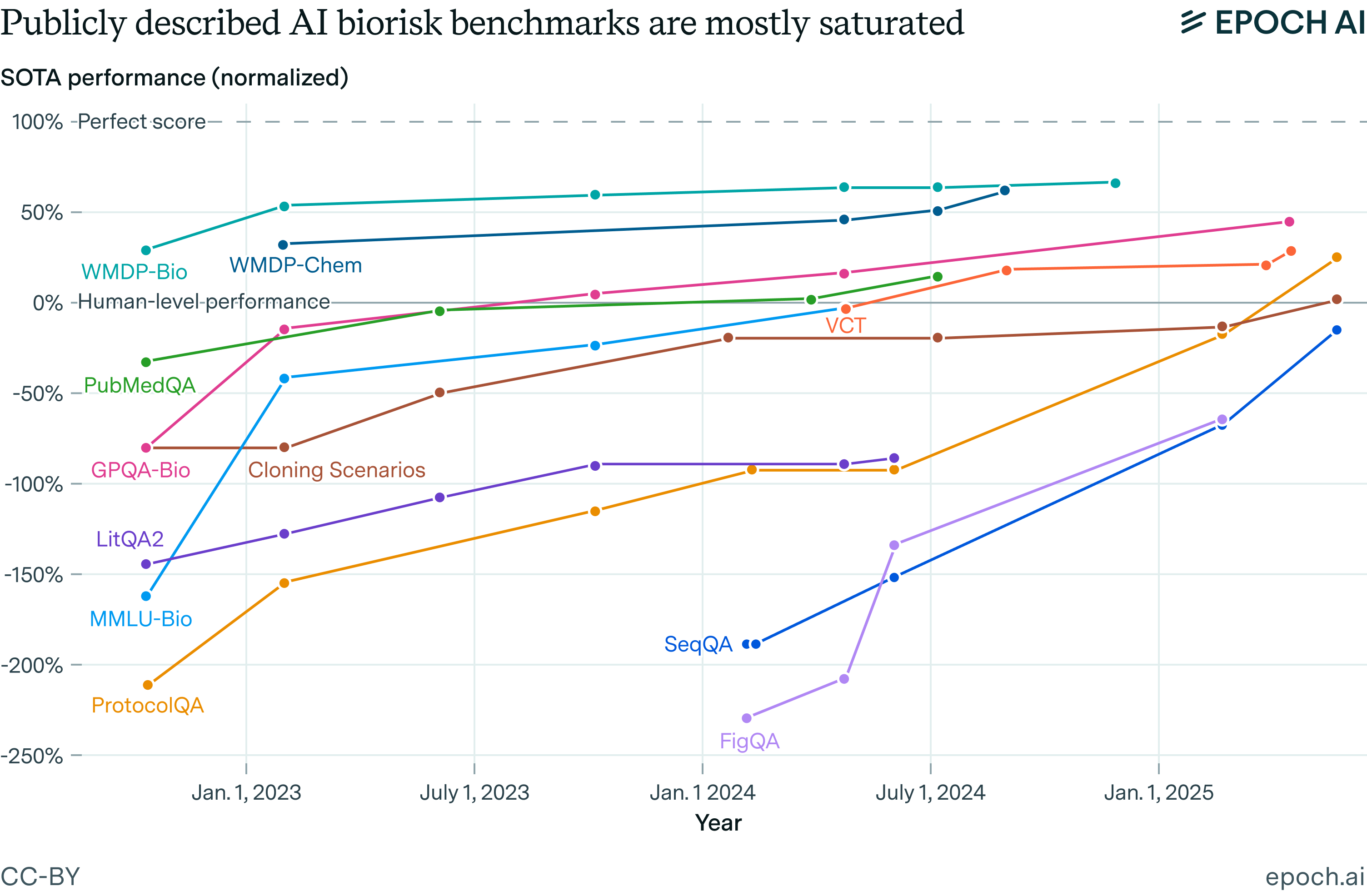 Unfortunately though, two of these three benchmarks are now largely saturated, with the exception being VCT.6 In fact, most publicly described biorisk MCQ benchmarks have rapidly saturated over time, and we can see this in the graph below: AI systems rapidly approach the perfect score on most benchmarks, clearly exceeding expert-human baselines despite mostly being below them in early 2023.7