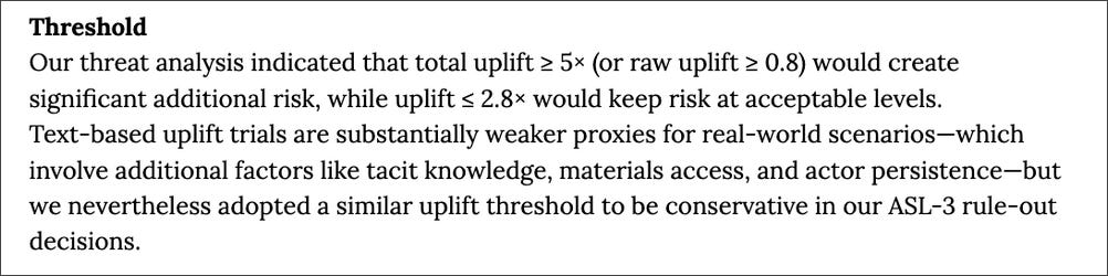 Another issue is that the remaining (non-publicly described or non-benchmark) evaluations are often very light on detail, making it essentially impossible to know what exactly these evaluations are testing.10 For example, consider the following description from the Claude Opus 4 model card, defining the threshold for “significant additional risk” in their bioweapons acquisition uplift trial: