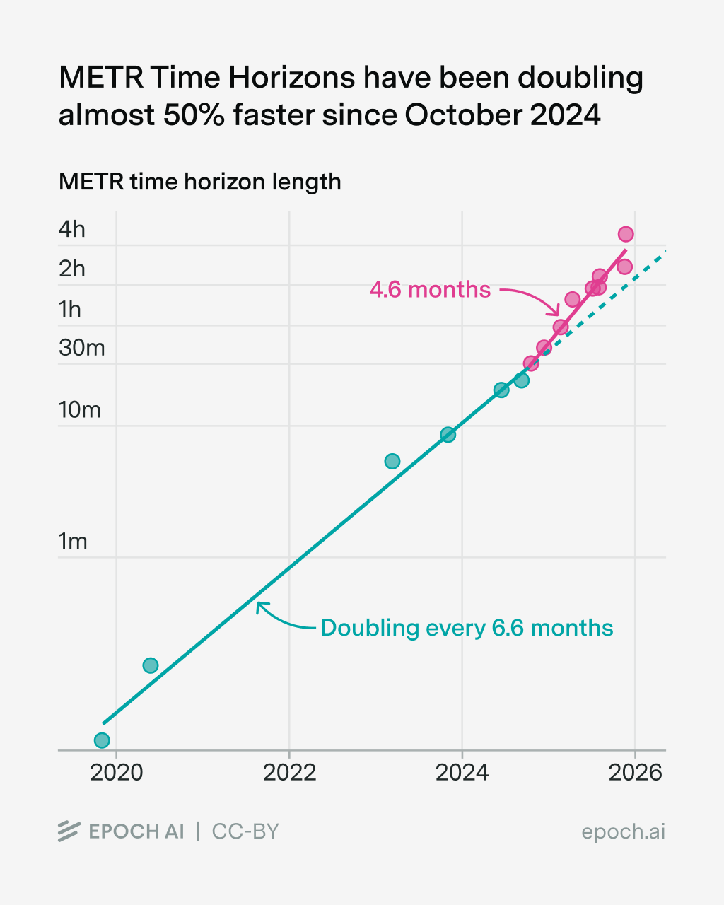 This acceleration roughly coincides with the rise of reasoning models and increased focus on reinforcement learning at frontier labs. The METR Time Horizon benchmark shows a similar pattern, with a 40% acceleration in October 2024.