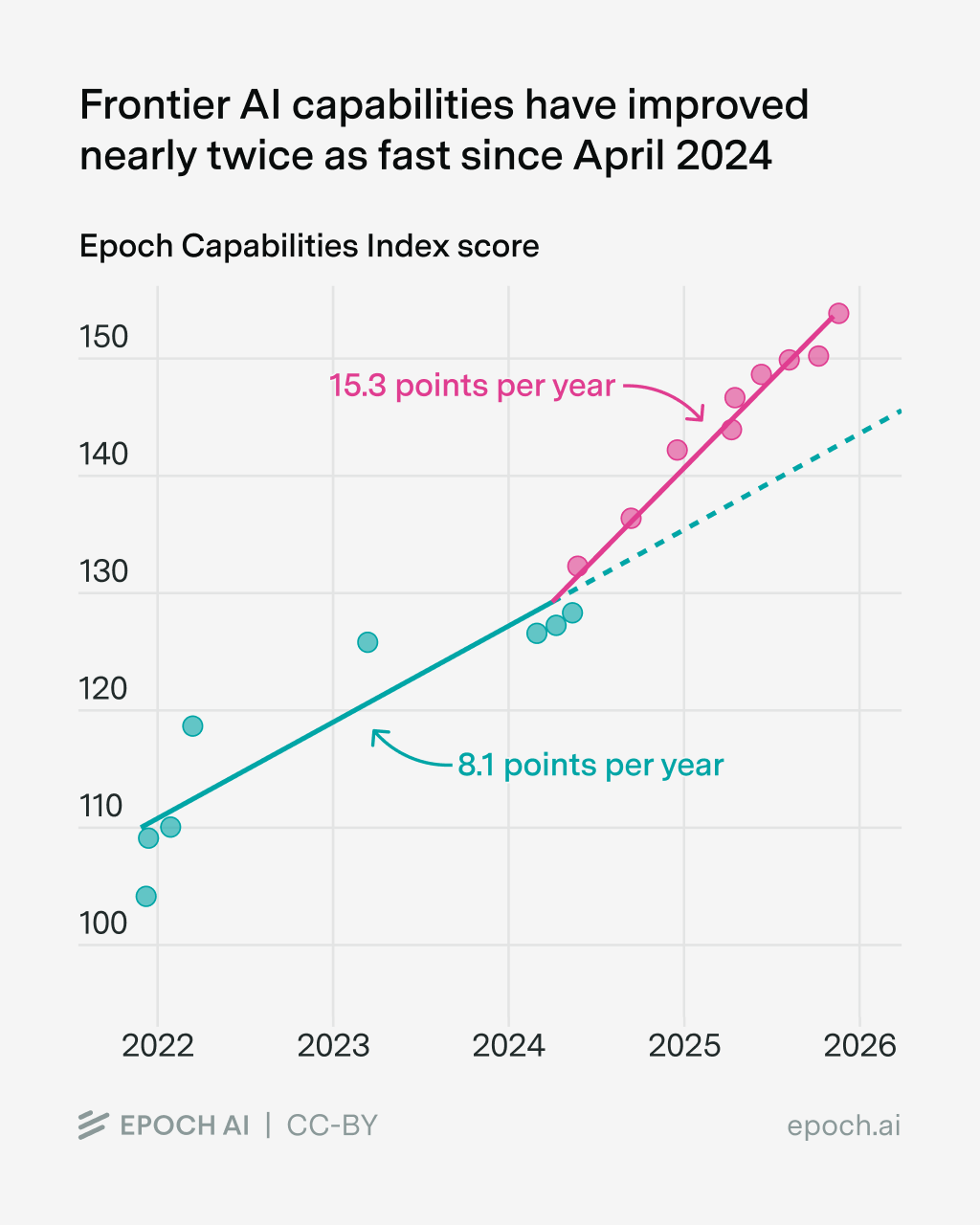 According to our Epoch Capabilities Index, frontier model improvement nearly doubled in pace, from ~8 points/year prior to April 2024, to ~15 points/year thereafter.