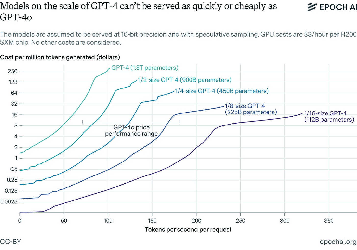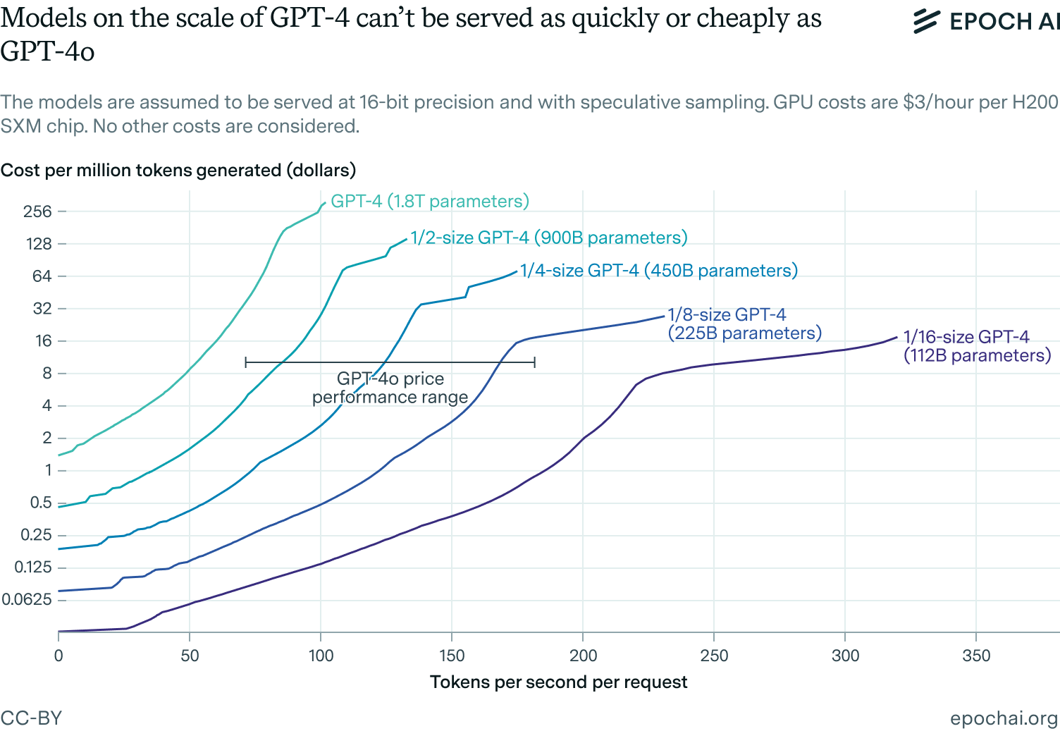 We can also use theoretical models of inference economics to predict how cheaply GPT-4 could be served on H200s. Assuming an opportunity cost of $3 per hour for using an H200 to do inference, the figure below shows how fast we can generate tokens at which price points when serving GPT-4 and hypothetical scaled-down versions of it for inference.