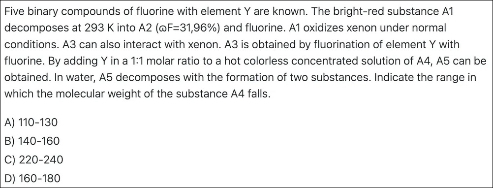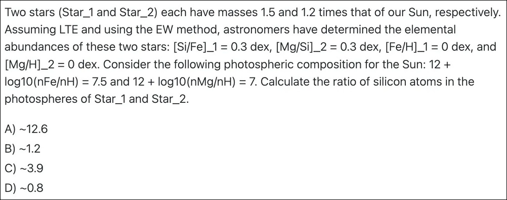 I think this one is just flawed: the information contained in the second sentence appears to fully determine the answer to be 3.98. The models all find this derivation and choose (C), since it’s closest. The author clearly intends for the photospheric composition of the sun to be relevant as well, but it seems plausible to me that they just failed to make it come together. The first validator raised just such a concern, and, while the author did revise the question after that, it’s unclear if they did so adequately. I give this one only a 10% chance of being correct.