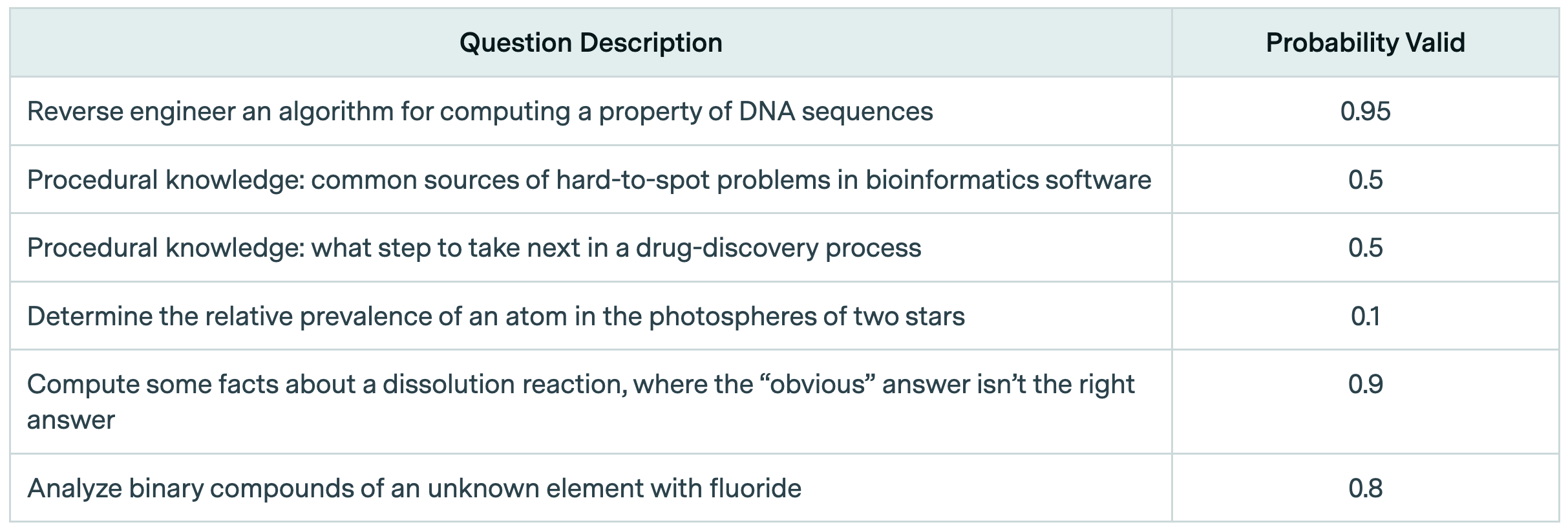 The expert evaluators are split, amusingly. The first one said the first version of the question was too easy, and suggested dropping a few hints, which the author did. The second said, “The enormous assumption that needs to be made to get the right answer is unrealistic.” Still, they both got it right. We happen to have a molecular biology PhD on staff, and he also got it right.4