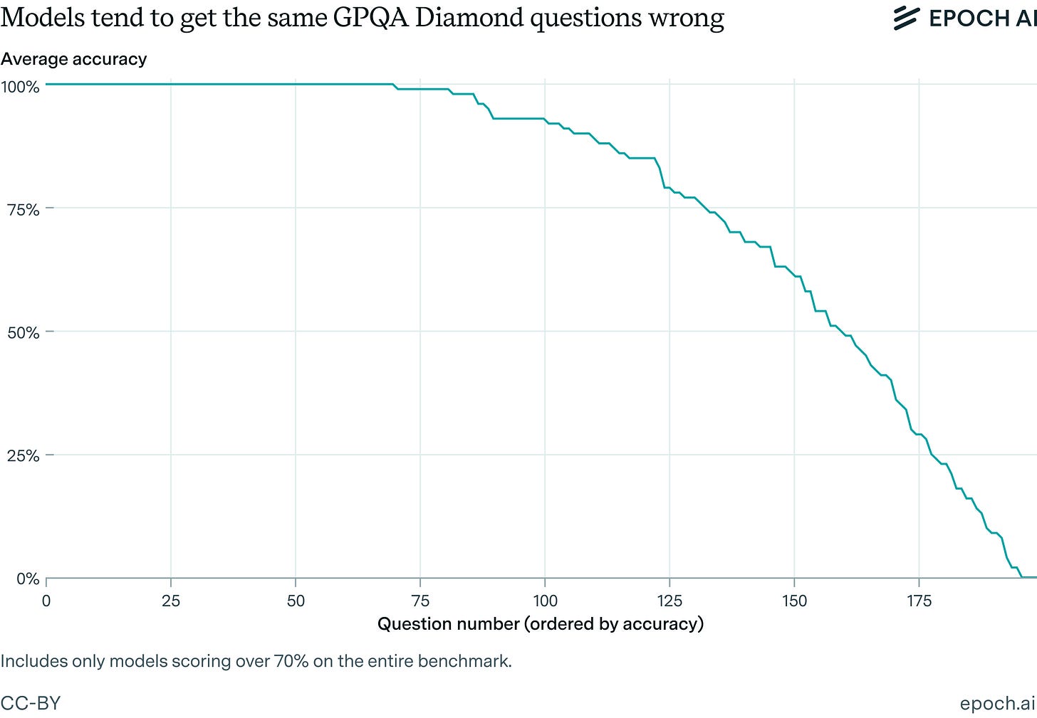 Note that if models’ answers were completely uncorrelated with each other, then an ensemble of models would actually completely solve the benchmark. Since the top-scoring models get 76% on average, we’d expect each question to be answered correctly by 76% of the models, and so the majority vote would get every question right.