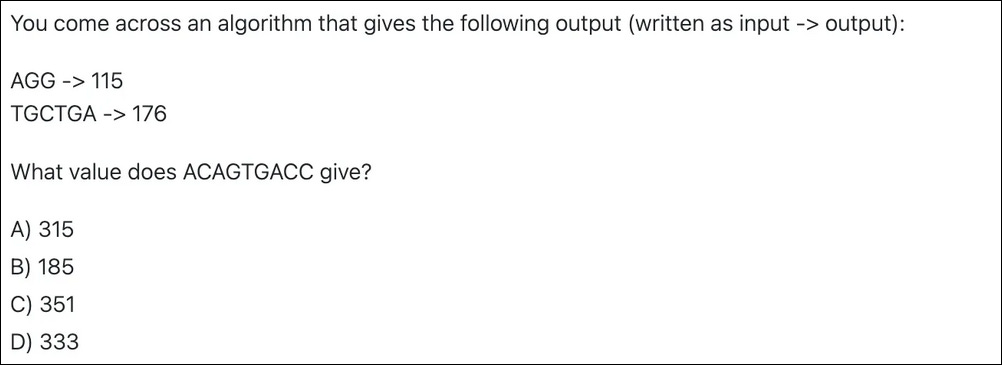 I’ll start with my favorite question, which involves reverse engineering an algorithm that computes some property of a DNA sequence.