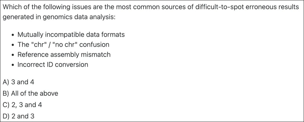 Reading the expert author and validators’ discussion, though, it doesn’t sound so subjective. According to them, if you’re an experienced bioinformaticist, you’ve tangled with the issues in the first question before, and you know which ones cause obvious vs. hard-to-spot errors. On the second question, both validators get it right. One says, “The wrong choices were a bit confusing but if you have enough knowledge you can spot them.” So, maybe?