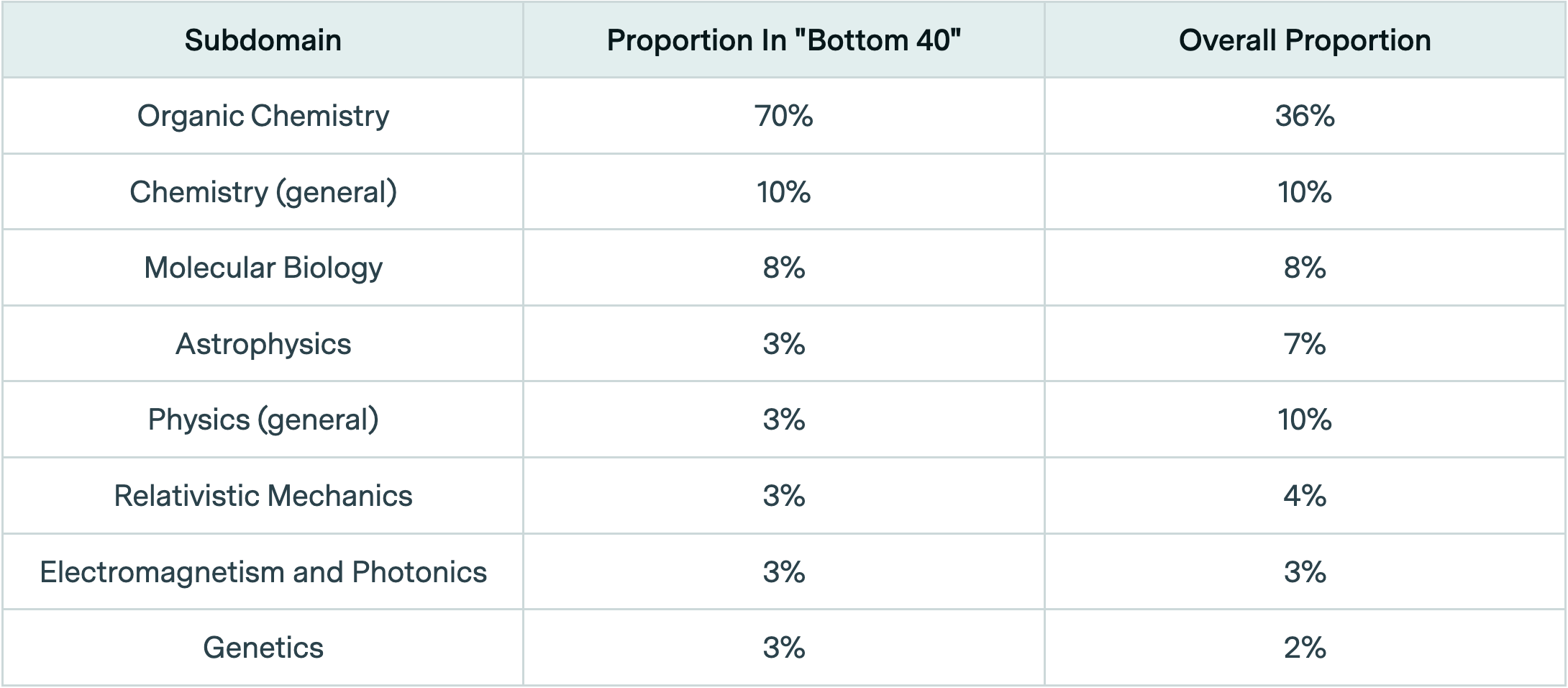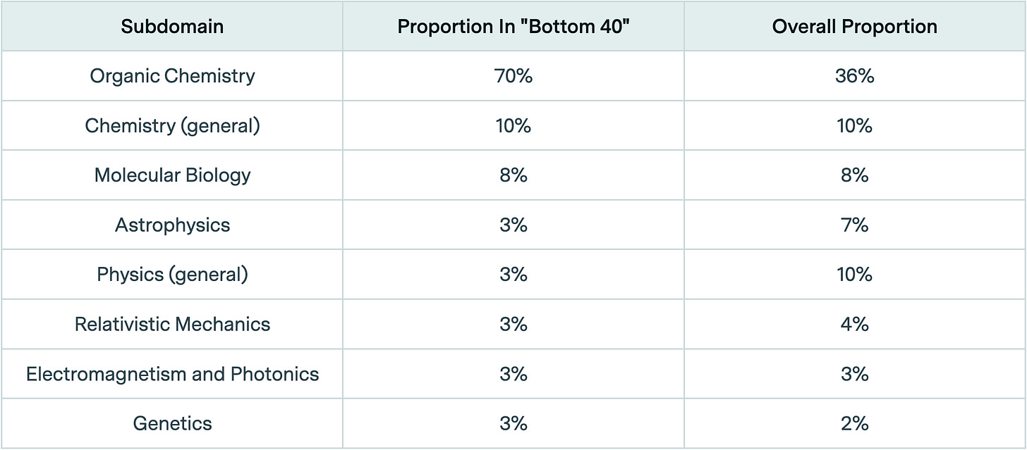 In addition to the three high-level domains, GPQA Diamond questions are categorized by subdomain. Looking at this breakdown, organic chemistry is highly over-represented: it accounts for 70% of the 40 questions we are considering, vs. only 36% of the entire benchmark