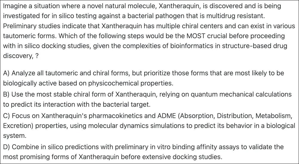 On the second question, the models exclusively prefer the same wrong answer, (A). I don’t have a great explanation for this, though it does sound the most directly-related to the question, and maybe they fall back to that in absence of other knowledge. Or maybe it’s arguably right. As for why they don’t like the right answer: it looks like the “preliminary in vitro” studies seem to them to be jumping the gun. That sounds reasonable to me, but I don’t work in drug discovery!
