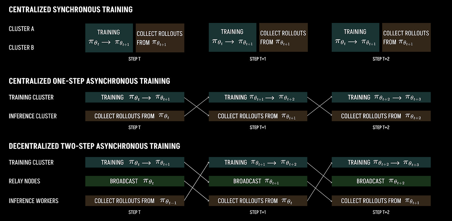 The largest decentralized RL training run to date is INTELLECT-2 by Prime Intellect, which coordinated the output of over 800+ nodes to generate traces and post train a QwQ-32B base model using asynchronous RL.