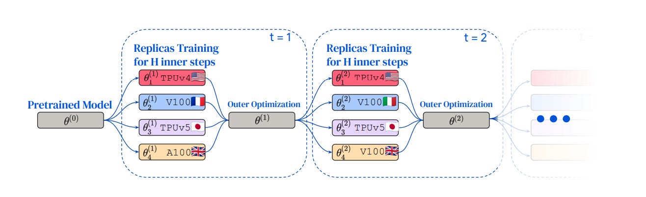 One solution is to reduce the frequency with which each data center or individual computer (each node) talks to each other. So instead of synchronizing weights with every batch, we let each node process multiple batches independently (these are called “inner steps”), then aggregate the cumulative gradient updates each node has taken in the synchronization step (an “outer step”).