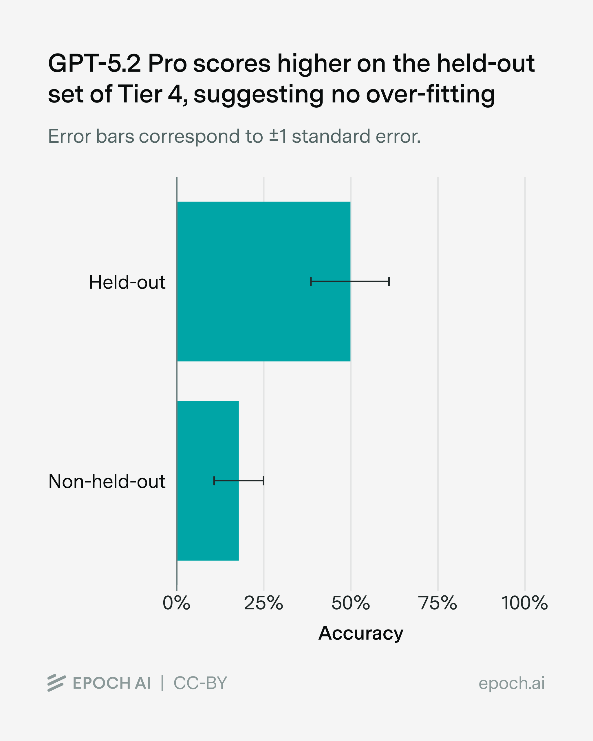 OpenAI has exclusive access to 28 Tier 4 problems and their solutions, with Epoch holding out the other 20 problems. GPT-5.2 Pro solved 5 (18%) of the non-held-out set and 10 (50%) of the held-out set. In other words: no evidence of over-fitting.