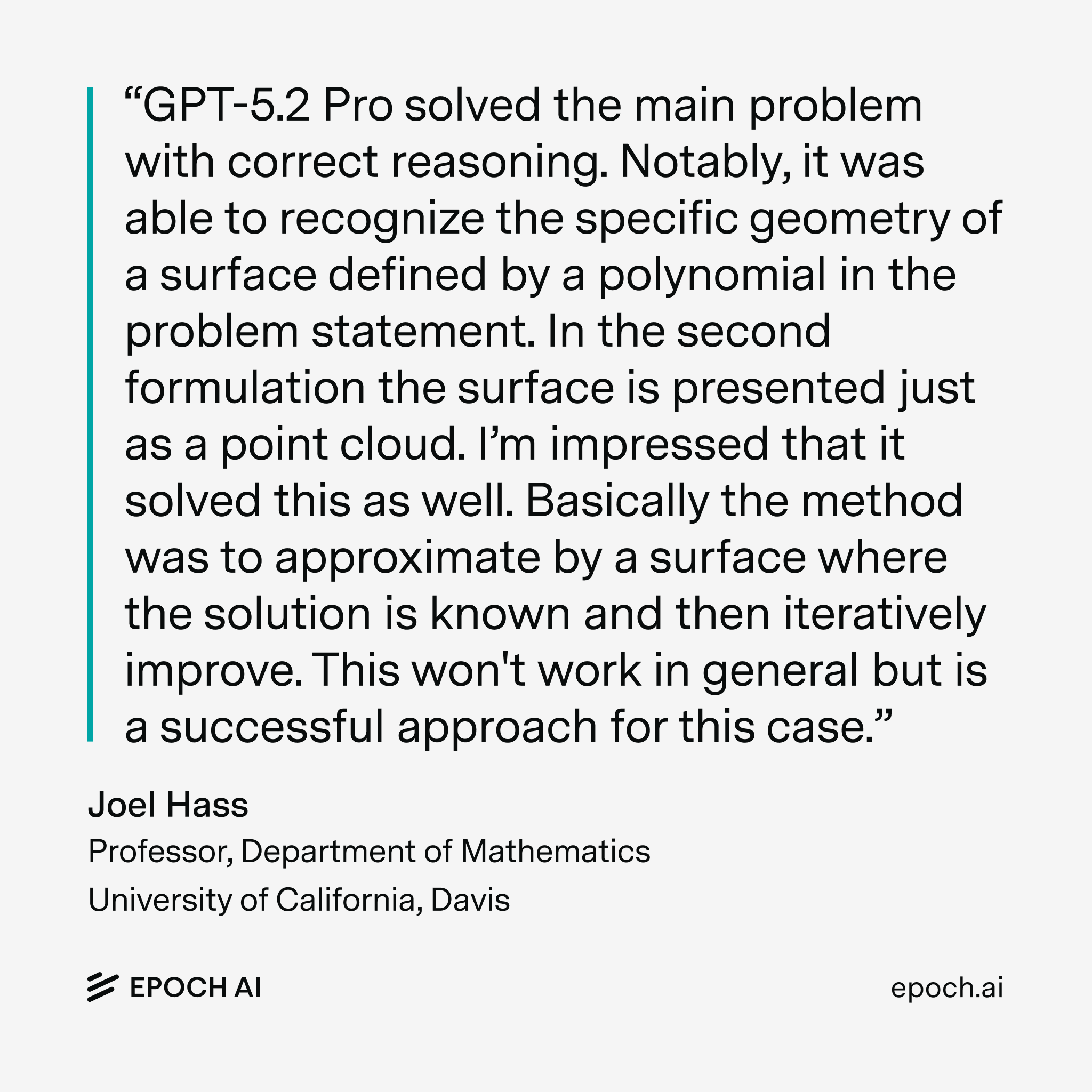 One of the newly-solved problems was from Joel Hass, whose research is in low-dimensional topology and geometry. Afterward, he suggested we try a different, more challenging formulation of the same problem. GPT-5.2 Pro solved that too.