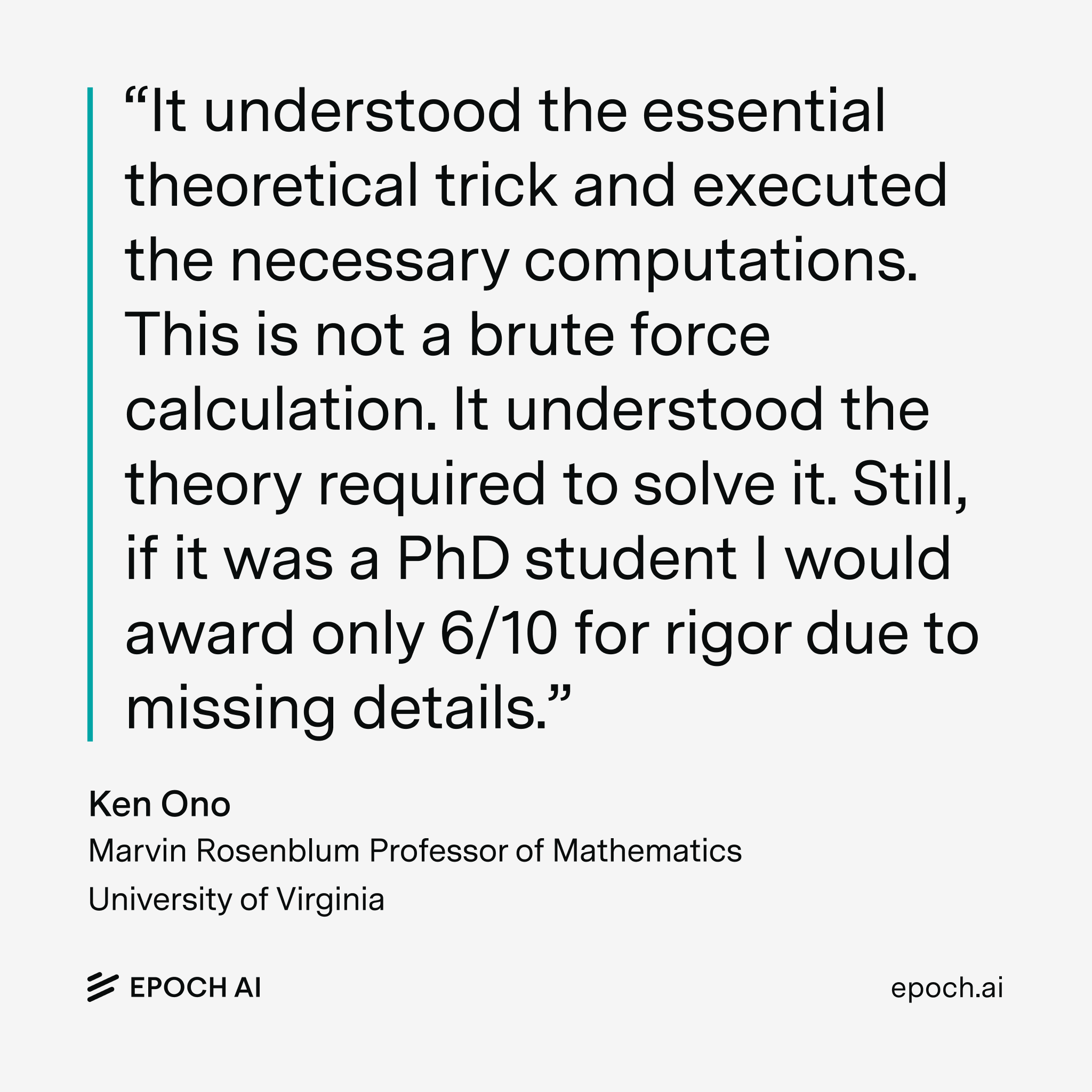 Another problem, by number theorist Ken Ono was initially solved by GPT-5.2 (xhigh), and also by GPT-5.2 Pro. Ken gave the solution a generally favorable review, though noted that the rigor of its prose explanation was somewhat lacking.