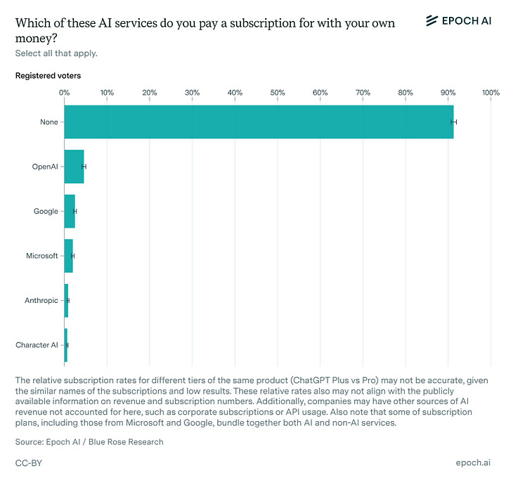 A key takeaway: A majority of Americans use AI on a weekly basis, with 35% using ChatGPT, 24% Gemini, and 13% Meta AI. However, less than ten percent of Americans paid for a subscription, with OpenAI again leading at 4.6%.