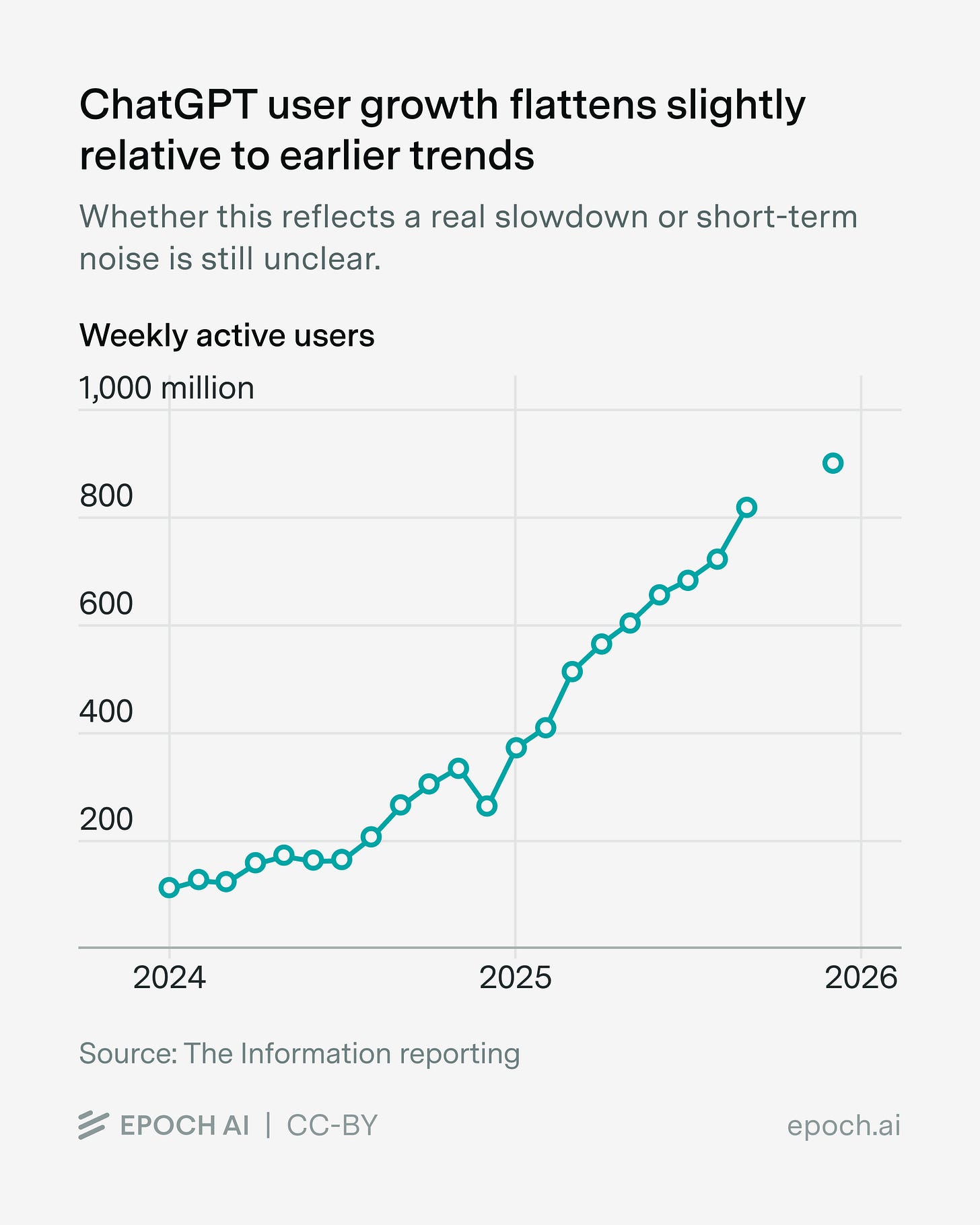 Through the first half of 2025, ChatGPT’s user base grew at a remarkable pace, from under 400 million weekly active users in January to nearly 800 million by August — roughly 50 million new users per month. Since then, growth may have slowed slightly, though it’s a bit soon to tell how much of this is noise versus a lasting trend change: