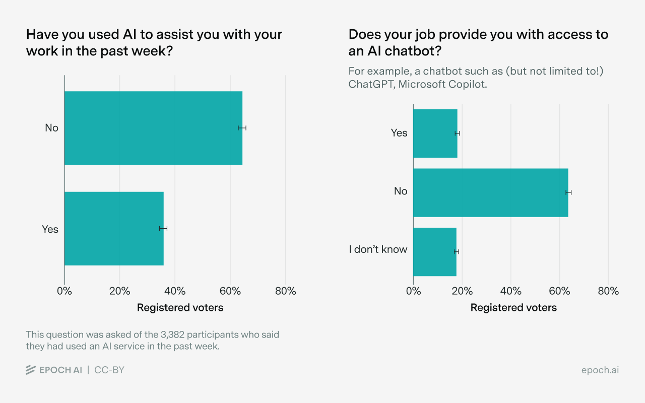 But this misses a large share of actual work usage — many people are using AI for their jobs, even if their employers don’t provide them access. We can see this by looking at our survey data. On the one hand, 36% of respondents who used AI in the past week said they had used it to assist with work. On the other hand, only about 18% of those same respondents said that their job provides access to an AI chatbot, and another 18% weren’t sure!