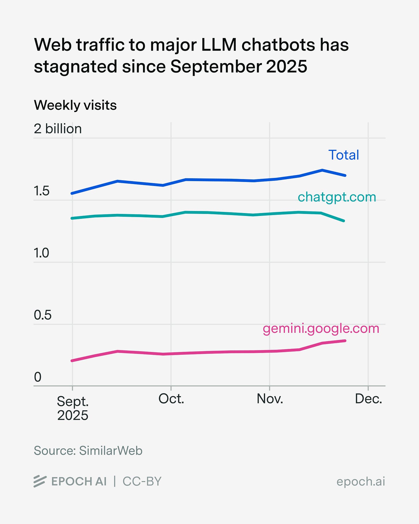For example, one metric we can check is recent web traffic. According to SimilarWeb, ChatGPT’s web traffic has been essentially flat since September 2025. In contrast, Gemini’s traffic has grown somewhat over that same period, though it started from a smaller base, such that the combined web traffic across the two models has stagnated.