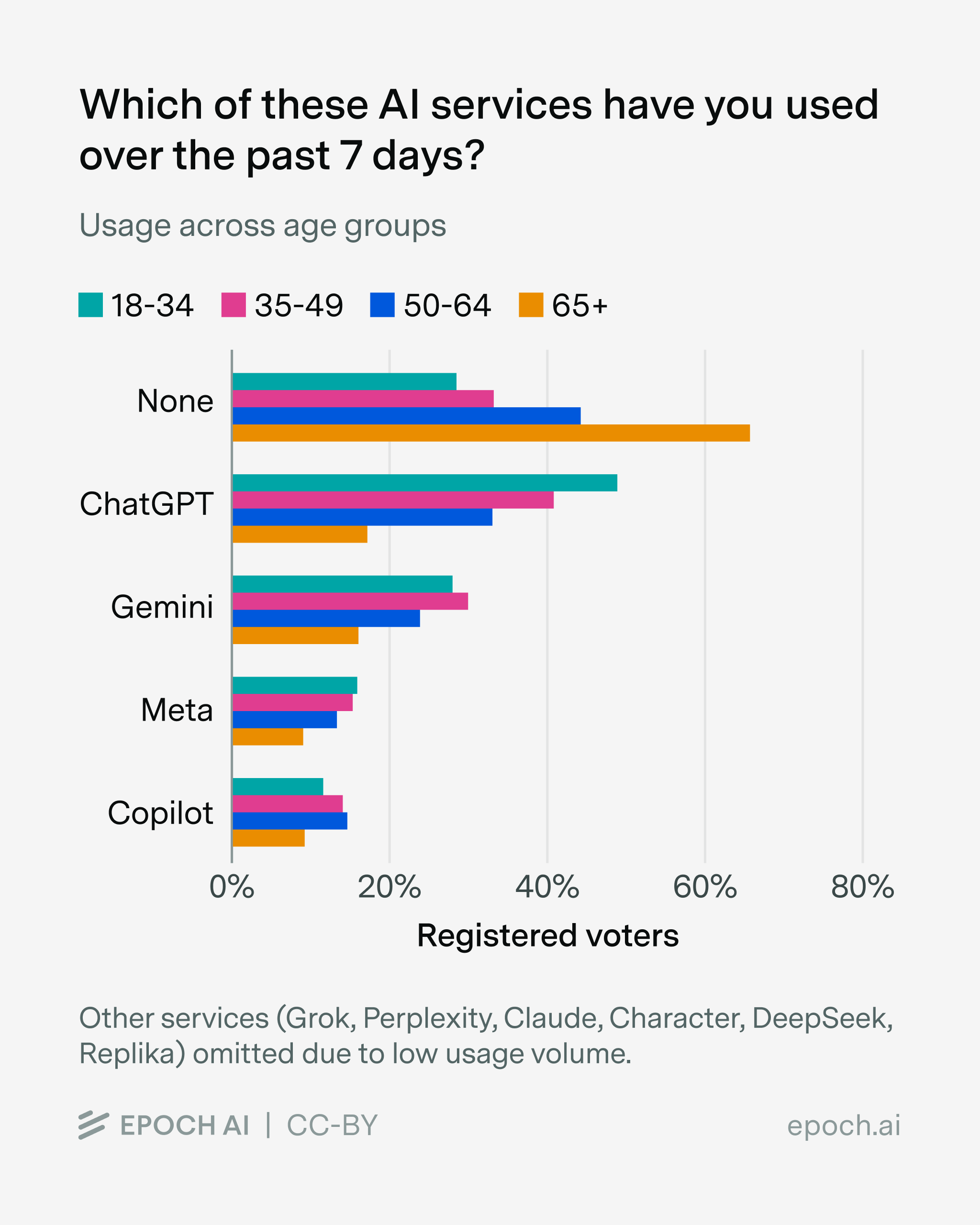 Does this mean that LLM adoption has slowed down? Not necessarily — even if ChatGPT user growth is slowing, other LLMs have recently seen faster consumer growth. For example, between August and November, Gemini monthly active users increased about 30%, compared to 5% for ChatGPT. And that’s not because Gemini has very few users — both Gemini and ChatGPT have hundreds of millions of monthly active users. That said, ChatGPT still maintains the larger userbase: in our poll, about 35% of registered voters reported having used ChatGPT over the past week, compared to 24% for Gemini.