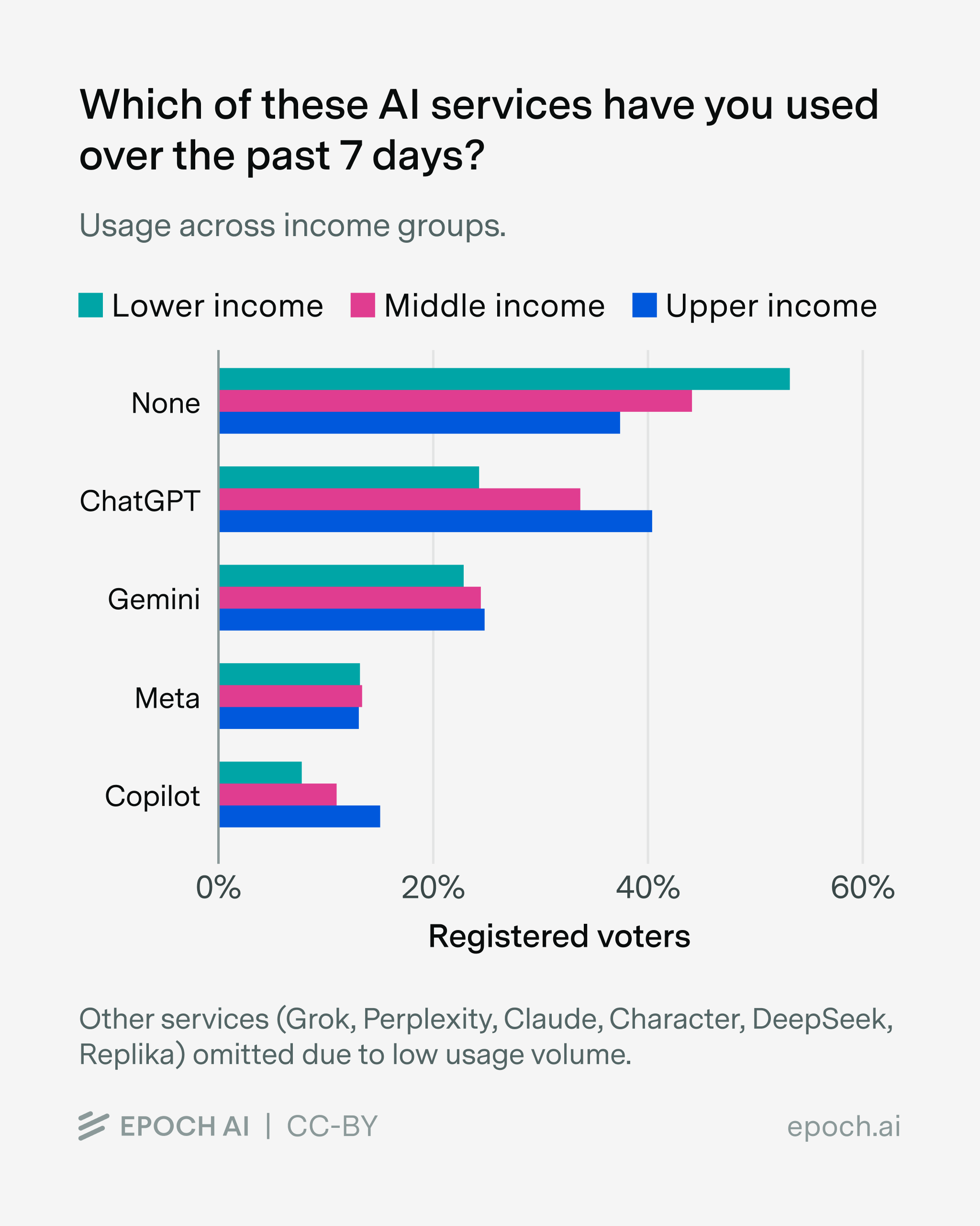Who is using AI? We found that higher-income respondents were substantially more likely to have used AI in the past week, and the pattern holds across services: ChatGPT, Gemini, and Copilot usage all skew toward upper-income groups.