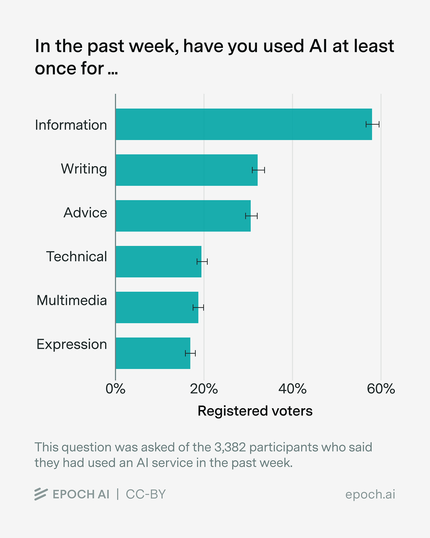 On paper, modern frontier LLMs are optimized for a wide range of tasks, such as coding and writing. But there’s one use case that stands out by far — looking up information. About 58% of AI users in our survey reported using it for this purpose in the past week. Writing assistance (32%) and advice (30%) came next, followed by technical tasks (18%), multimedia (17%), and self-expression (16%).