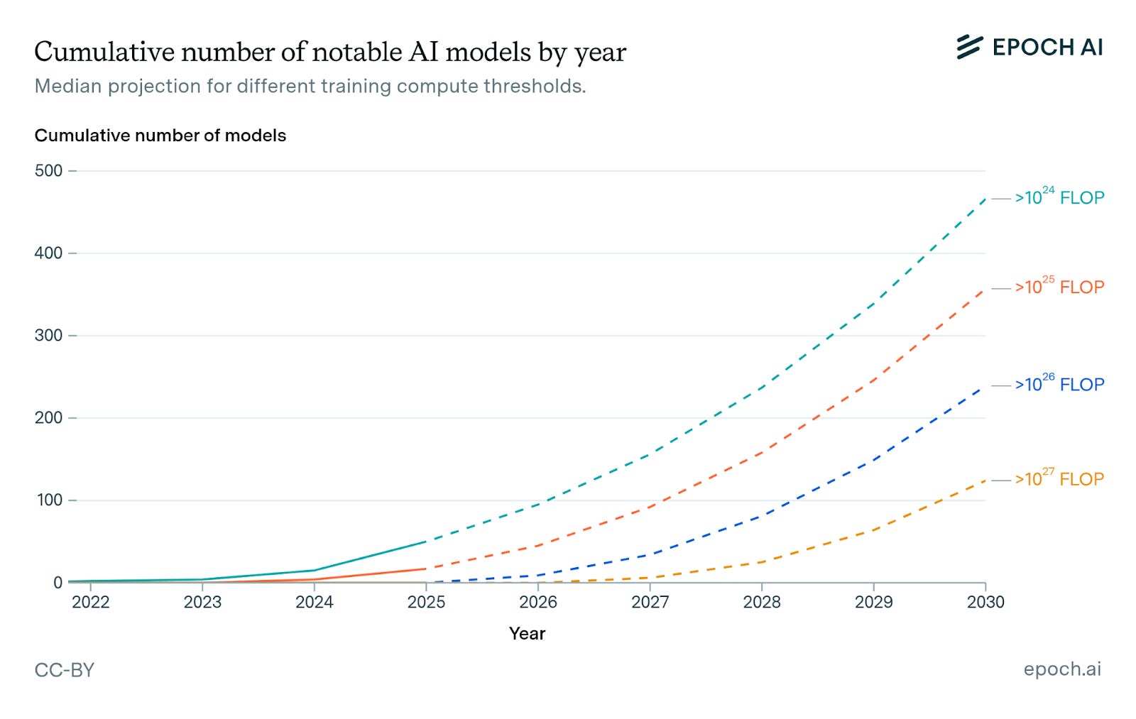 Our model takes key inputs like compute investment and the distribution of compute to arrive at a range of projections. We find that the number of notable AI models above a given compute threshold rapidly accelerates over time. For example, the first model in our dataset estimated to use over 1e26 FLOP was Grok-3 from xAI, released in February 2025. Extrapolating current trends, there would be around 30 such models by the start of 2027, and over 200 models by the start of 2030.