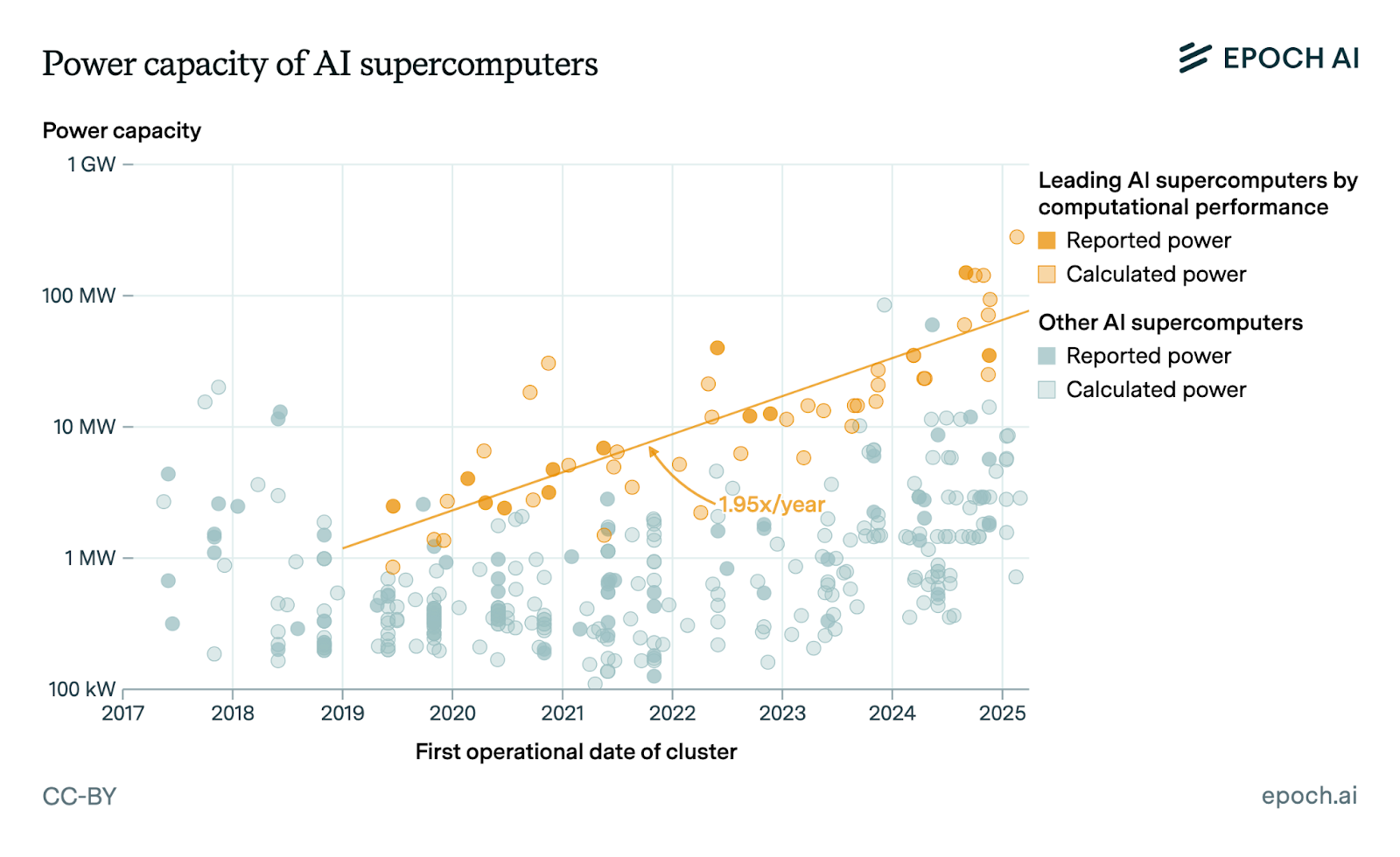 We curated a dataset of over 500 AI supercomputers (sometimes called GPU clusters or AI data centers) from 2019 to 2025 and analyzed key trends in performance, power needs, hardware cost, and ownership. Some key findings: