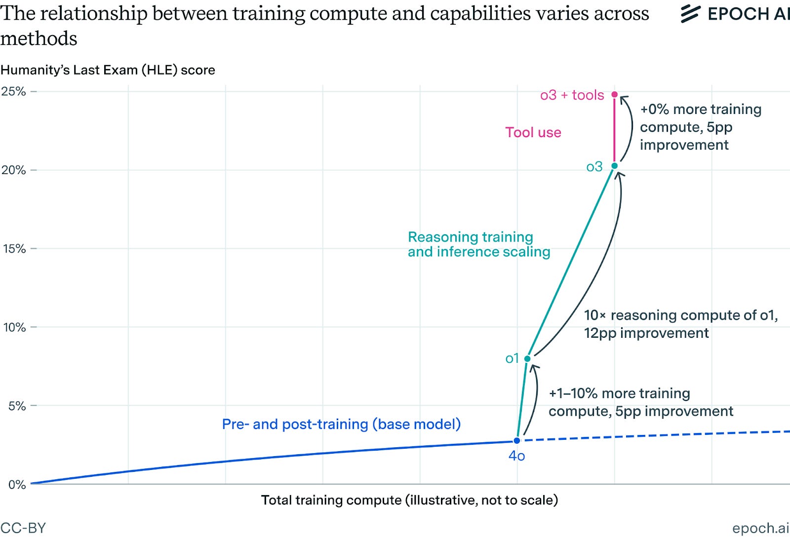 Not all uses of compute contribute equally to model capabilities: For example, recent “reasoning training” methods during post-training often yield higher capability gains compared to other post-training interventions, per unit of computation.