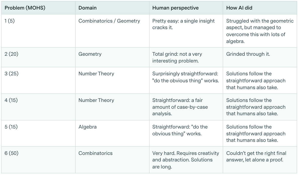 If nothing else, the IMO showed that cranked-up LLMs can indeed deliver reliable results in one such domain, at least when the required reasoning isn’t too hard. But, in terms of identifying the emergence of reasoning capabilities beyond medium-difficulty IMO problems, we’ll have to look to other evaluations.