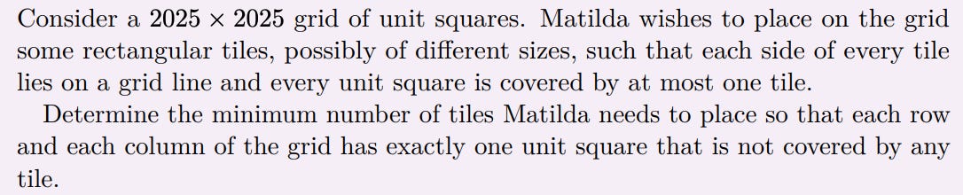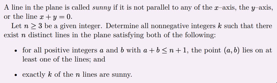Funnily enough, the first problem might be the most interesting, even though it’s the easiest for humans. It’s a combinatorics problem with a geometric flavor, which LLMs have tended to struggle with due to their general lack of spatial intuition. No publicly available model solved it on MathArena. How did the experimental models solve it? Here’s the problem: