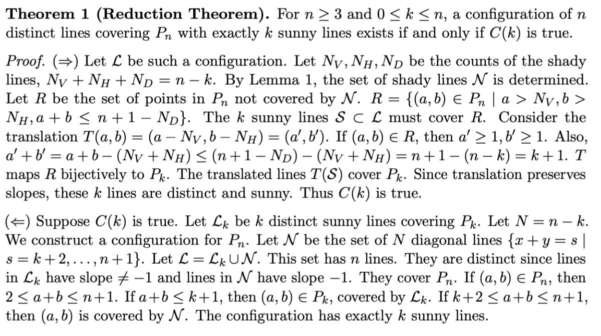 The key observation for a human is that, when n≥4, one of the lines must cover one of the sides of the triangle. Once you realize that, you can reduce the problem to simply analyzing the n=3 case. Here’s how Chen’s reference solution expresses this reduction: