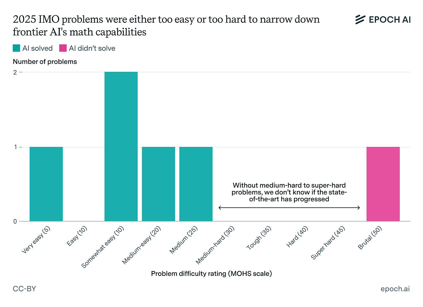 Taken at face value, this means AI math capabilities are somewhere between “medium” and “brutal”. I’ll argue that solving these easy-to-medium problems represents only incremental progress: a step forward primarily in terms of reliability, but not a sign of the emergence of any new capability. By the same token, failing to solve the “brutal” problem only rules out extremely rapid progress. That’s not to say these new models don’t have any new capabilities, just that we can’t tell it from this year’s IMO.