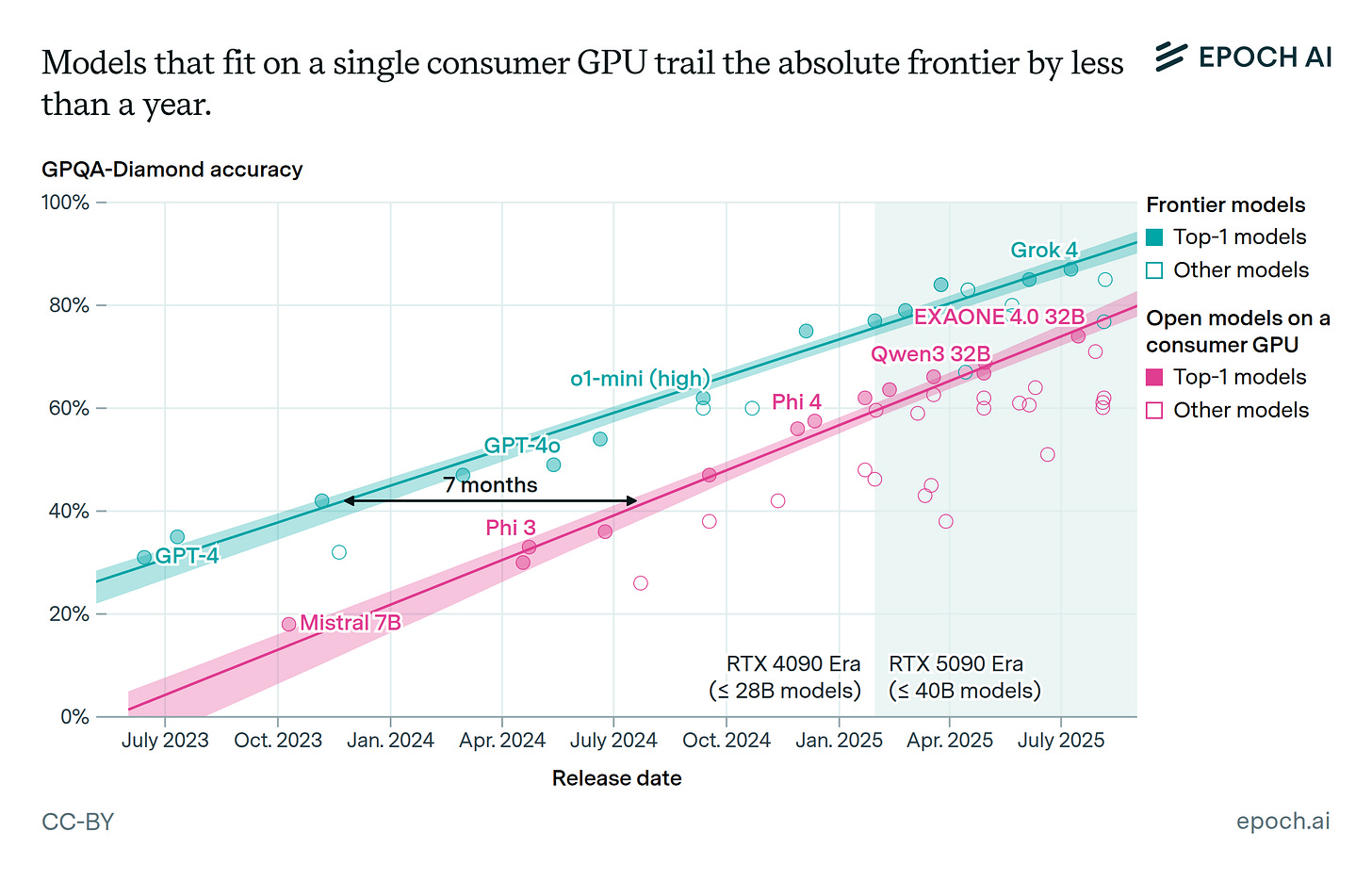 We looked at GPQA Diamond, MMLU -Pro, AA Intelligence and LMArena for Frontier models and open models. Across all four benchmarks we analyzed, models small enough to run on a single consumer GPU (≤28B params for RTX 4090, ≤40B for RTX 5090) consistently catch the frontier within 6-12 months. 1